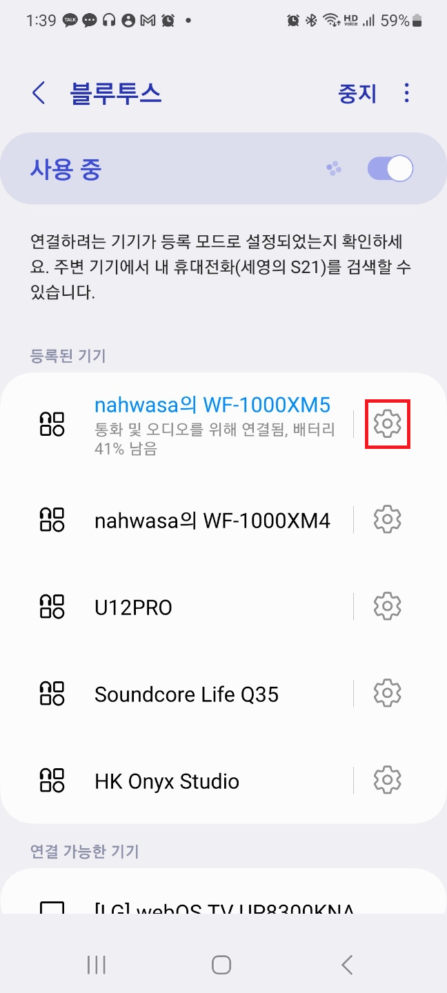 그리고 폰의 블루투스 설정에서 톱니바퀴를 누른다.